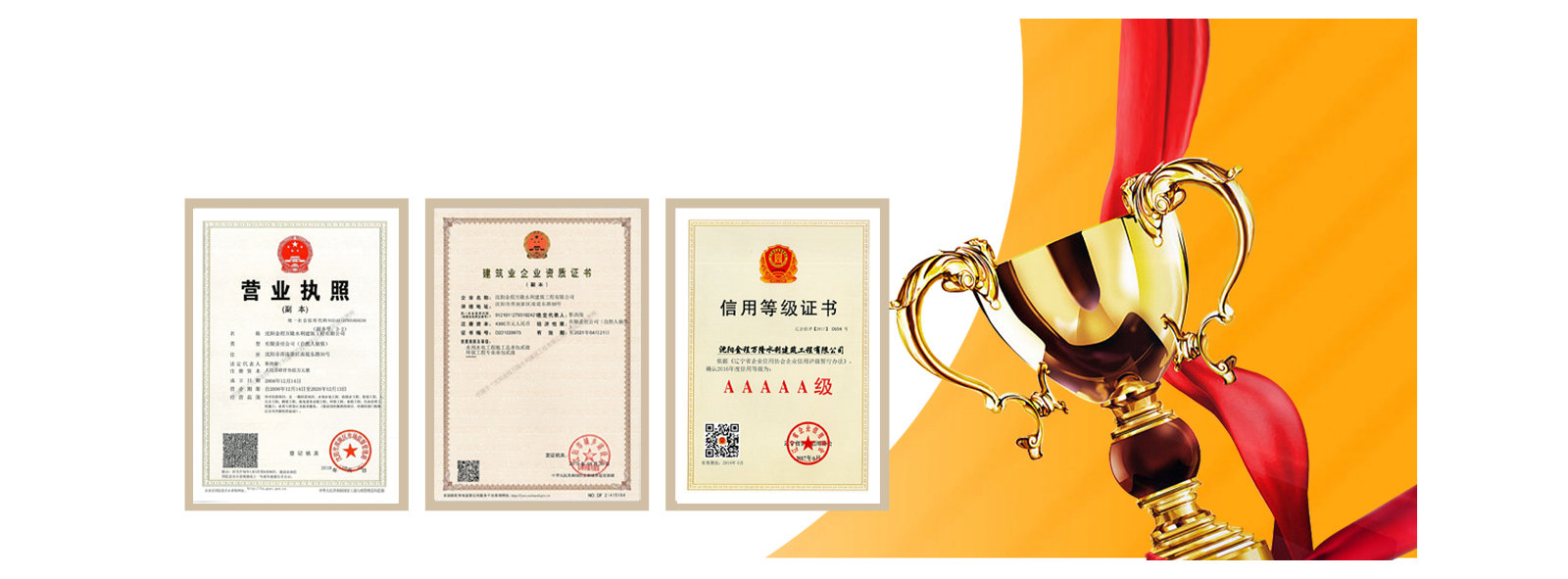 我公司先后受到遼寧省建筑業(yè)協(xié)會的好評,遼寧省及沈陽市工商局頒發(fā)的重合同守信譽(yù)企業(yè)稱號,勞動保障監(jiān)察書面誠信等級A,信用遼寧網(wǎng)站公示AAA等級,信用沈陽網(wǎng)站公示AAA等級,水利安全生產(chǎn)標(biāo)準(zhǔn)化二級單位,中國水利工程協(xié)會信用AAA等級,